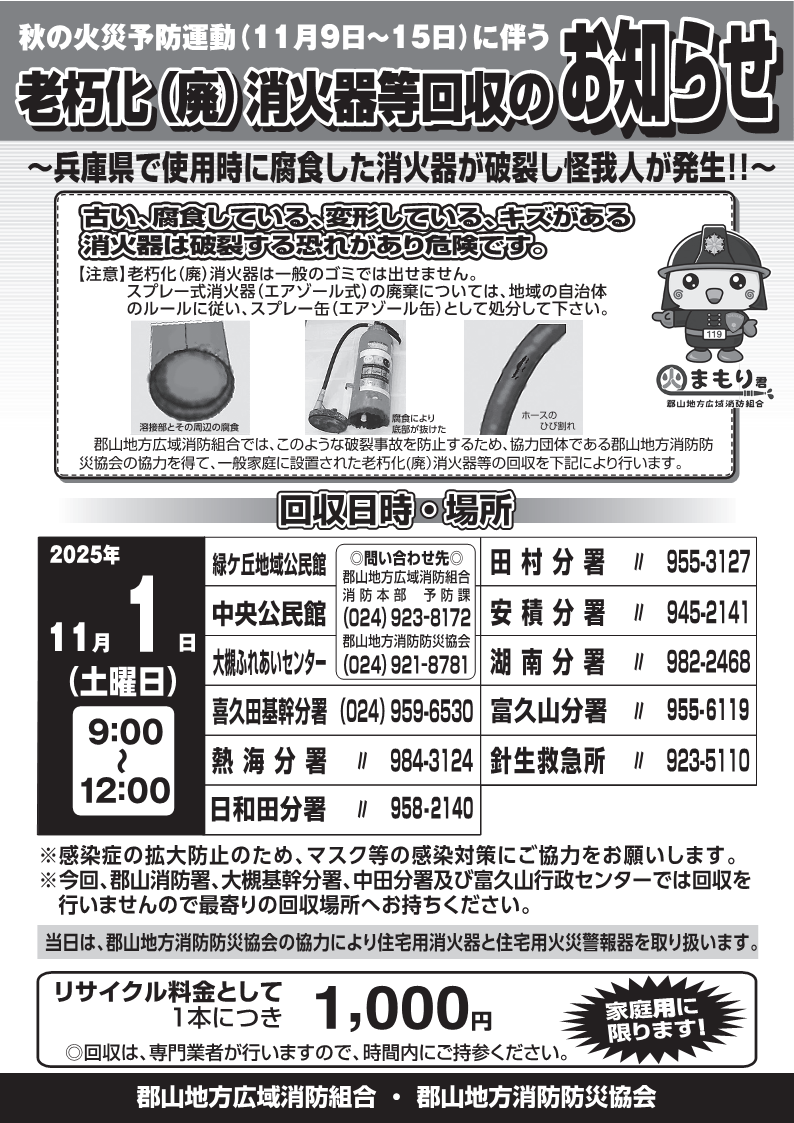 令和7年11月1日(土)、ご家庭にある古い消火器の回収を行います。