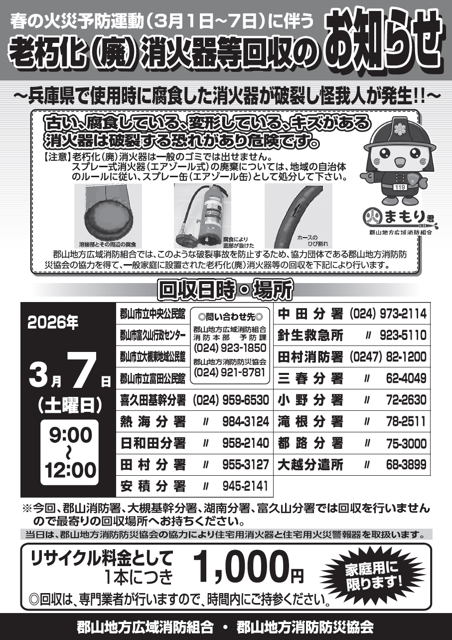 令和8年3月7日(土)、ご家庭にある古い消火器の回収を行います。