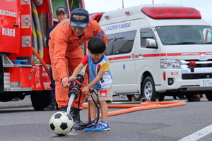 車両展示のほか、放水体験やミニ防火衣・ミニ救急服の試着などを行い、多くの方にお立ち寄りいただきました。
