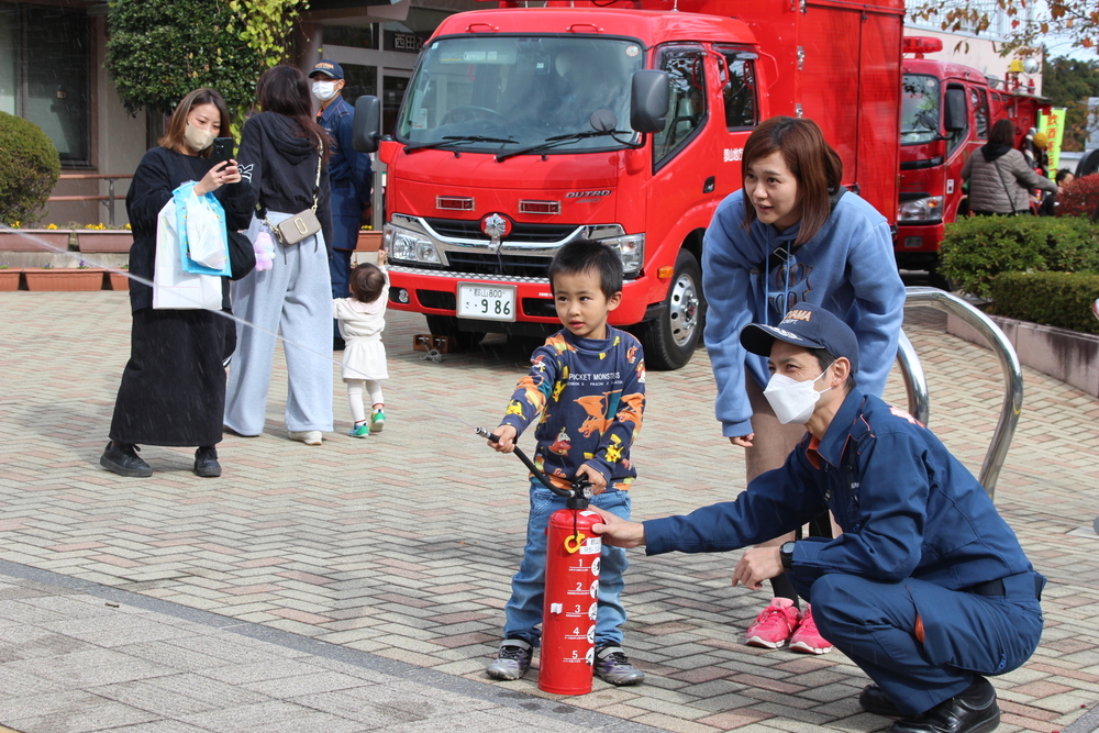 会場の消防ブースでは、水消火器での消火体験やミニ防火衣・ミニ救急服の試着体験を通じて、火災予防への意識を高めるとともに、住宅用火災警報器の設置率アンケートを実施しながら、住宅用火災警報器の重要性を住民の皆さんと共有しました。