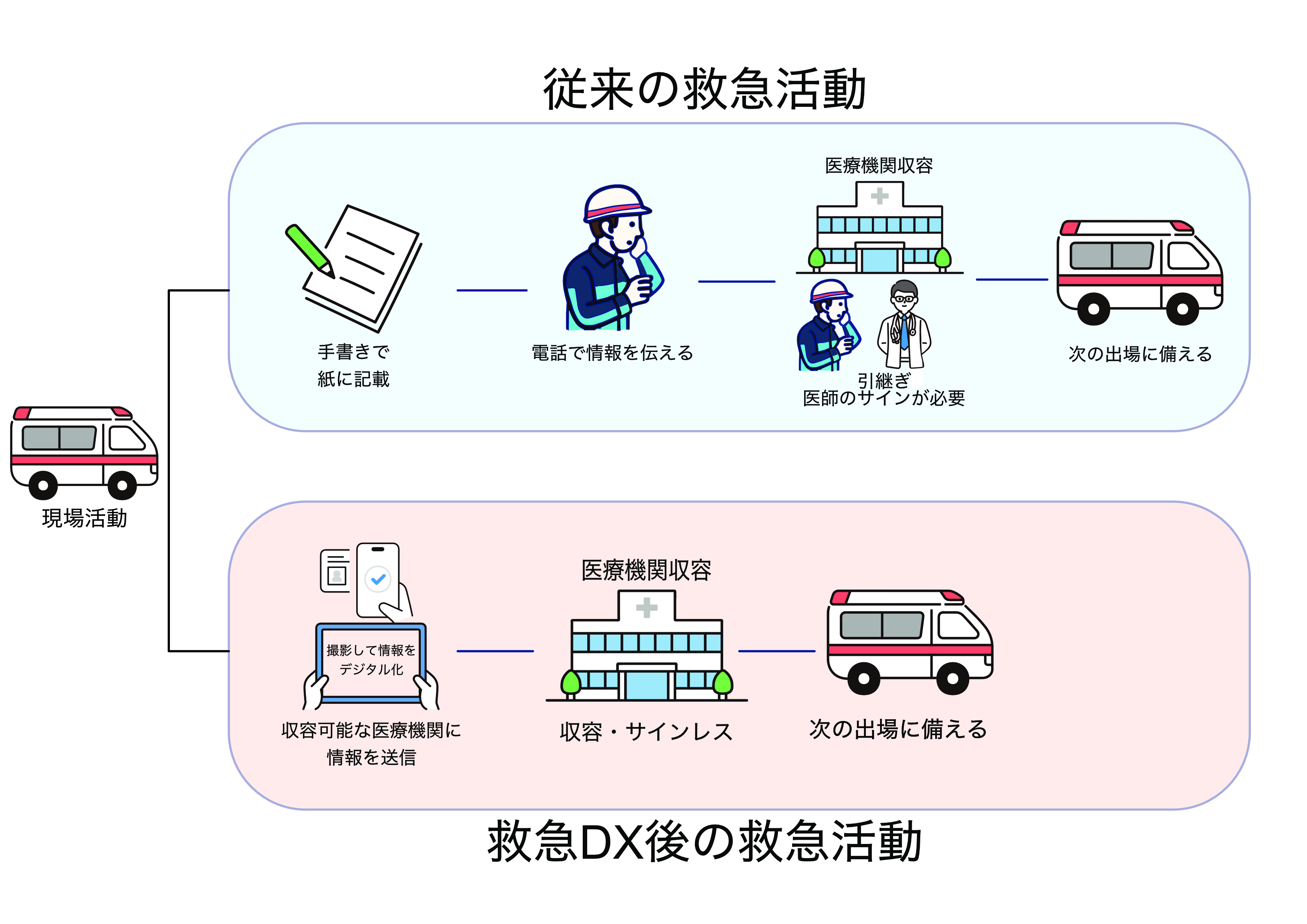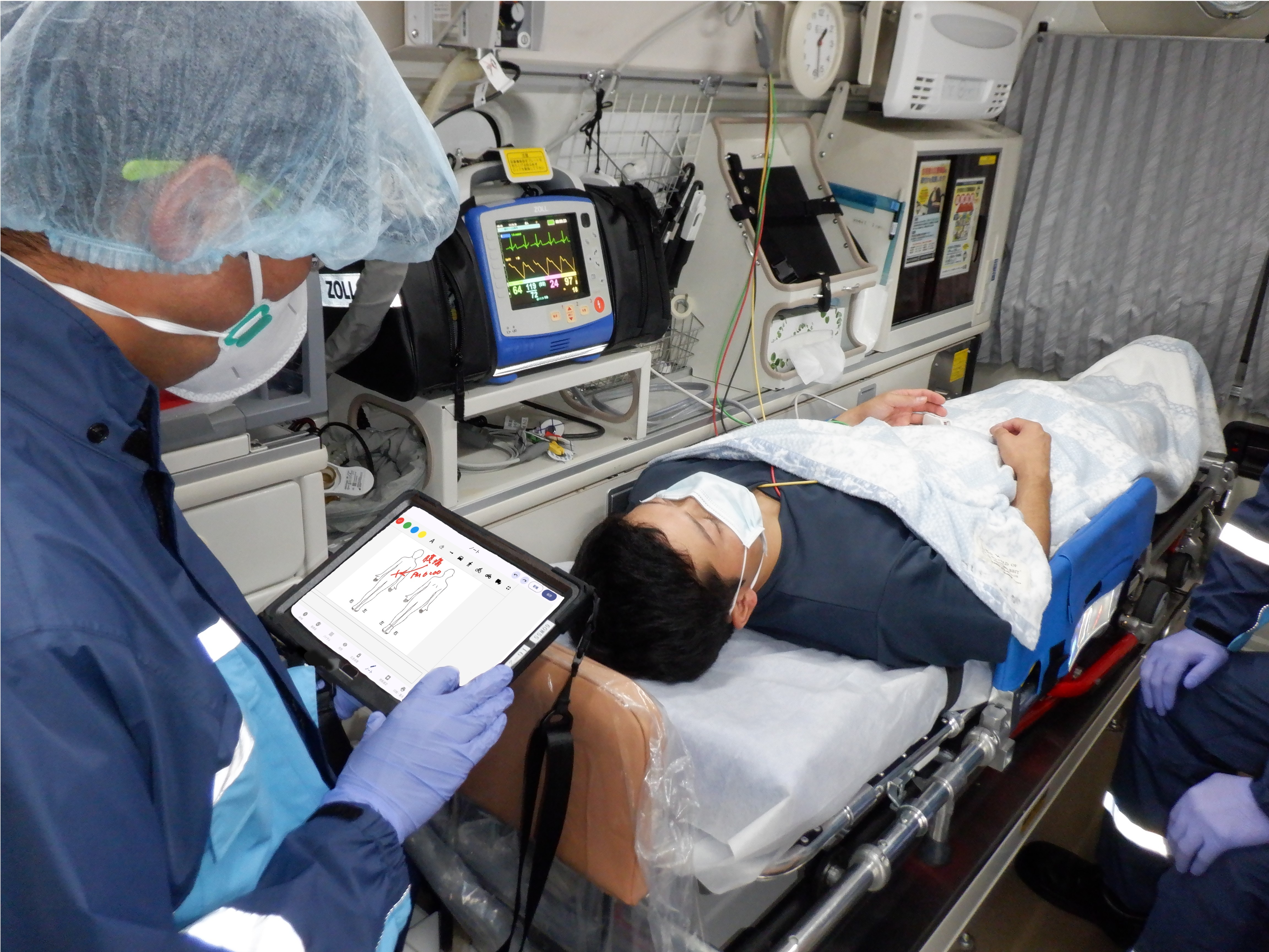 これまでは、救急現場から医療機関への情報は、電話で伝える形でしたが、今後は電話でのコミュニュケーションに加え、タブレット端末も活用し、傷病者情報や現場の状況をデジタルデータでリアルタイムに医療機関へ送信することが可能となります。その結果、傷病者が医療機関に到着する前に、詳細な情報を把握でき、医療機関側の受け入れ態勢が円滑になり、救命率の向上が期待されます。