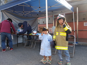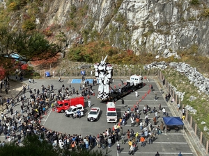 全高10mの実物大イングラムと一緒にポンプ車・救急車を展示しました。また、ミニ防火衣・ミニ救急服の試着コーナーを設け火災予防の啓発を行いました。