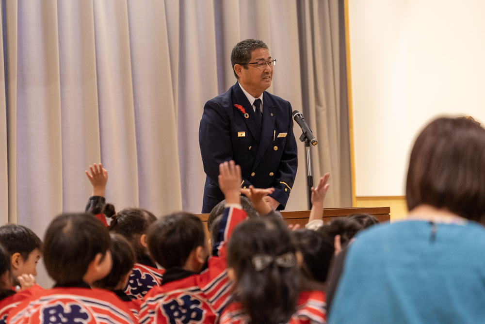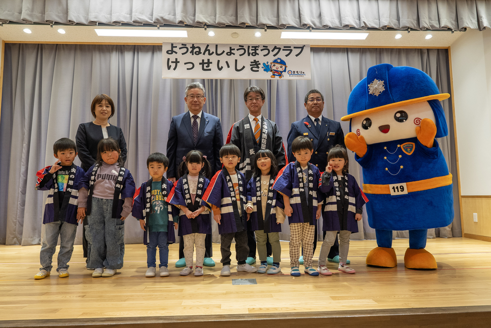 結成式では幼年消防クラブの法被を贈呈したほか、園児の皆さんが大きな声で誓いのことばを唱和しました。